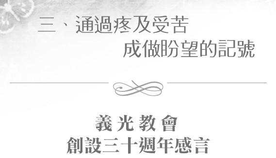 我相信重新塑造台灣人的心靈嘛是今日教會首要的課題。我真佩服林義雄先生,本身經過許呢大的痛苦及試煉後,今日猶原繼續.努力從事重建心靈的工作,不斷.撒疼的種子。基督徒佇基督十架的疼,認識上帝的疼,嘛決志欲宣揚及實踐此的疼。咱歡喜甘願付出服事人,無怨、無悔,因為基督的疼激勵咱。對基督的疼咱明白公義真正的涵義,佇堅持公平、原則中,咱無失去對別人的尊重與善意。