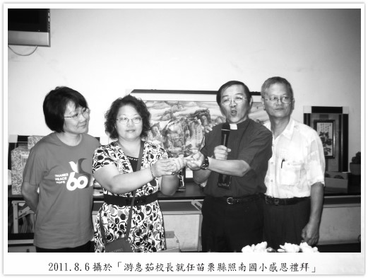 八月初辦了一場「就任感恩禮拜」,就是希望藉著我的上任帶給全校師生滿滿的祝福。義光教會的會友、牧師們,愛加倍的夥伴、通霄親朋好友等,讓會場座無虛席,在祝福與感恩的氣氛下,眾人見證了我榮任照南國小校長,這一刻,感謝父母的栽培,更感謝上帝的帶領!